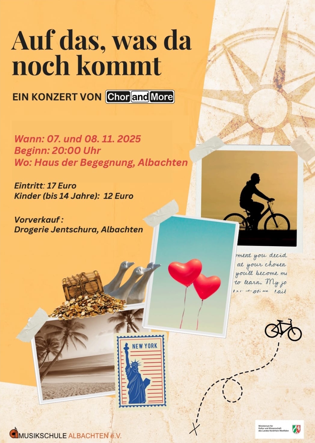 Chor and More ist ein gemischter Chor der Musikschule Albachten e.V., in dem rund 50 begeisterte Sängerinnen und Sänger im Alter von 17 bis 69 Jahren gemeinsam musizieren. Seit seiner Gründung im Jahr 1997 wurde der Chor bis 2017 von Halfrid Meyer-Hesse geleitet. Im Jahr 2017 hat Georg Homann die Leitung des Chores übernommen. Was uns verbindet, ist nicht nur die Liebe zum Singen, sondern auch die Freude an Gemeinschaft und musikalischer Vielfalt. Unser Repertoire ist bunt gemischt: Es umfasst geistliche, weltliche, klassische und vor allem moderne Stücke. Um unsere Auftritte noch lebendiger zu gestalten, wird das Gesangserlebnis durch eine kreative Rahmenhandlung choreographisch aufgelockert. Jährliche Probenwochenenden sind für uns eine wichtige Zeit der intensiven Vorbereitung auf unsere Konzerte. Hier können wir gemeinsam an unserer Performance feilen und die Chorgemeinschaft stärken.